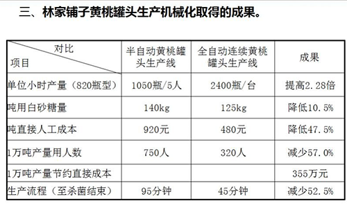 林家鋪子黃桃罐頭生產機械化取得的成果如下表(以下圖片由林家鋪子2010年當年采購使用后做的對照表):