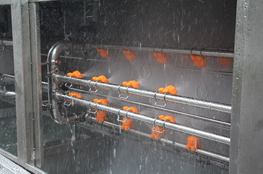 自動洗筐機又稱周轉筐清洗機預洗過程是水泵將水從預洗水箱中吸出,經噴嘴噴出,使食品或容器具各面收到清洗,洗掉雜物,清洗后的污水經過濾分離流回水箱,雜物排出。漂清過程是漂洗水泵將水從漂洗水箱中吸出,經噴嘴噴出,將被清洗物上的清洗劑等漂洗掉,水流至主清洗水箱。輸送系統采用變頻調速電機帶動,調節電機速度以控制清洗時間。該機側導向機構可調以適應不同規格清洗物品。