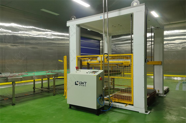 此過程中,由于沒有先進的設備,大部分廠家只能雇用大量的人工來完成實罐的碼垛、薄膜纏繞、卸跺作業。有的廠家甚至采取不可思議的辦法:先將罐頭人工裝入周轉紙箱,然后將紙箱堆疊到托盤上,送至保溫庫存放;然后人工卸下堆垛,取出罐頭,打檢噴碼,后再一次裝箱出庫。這不僅增加生產成本,也影響生產速度,罐型越小問題越突出。